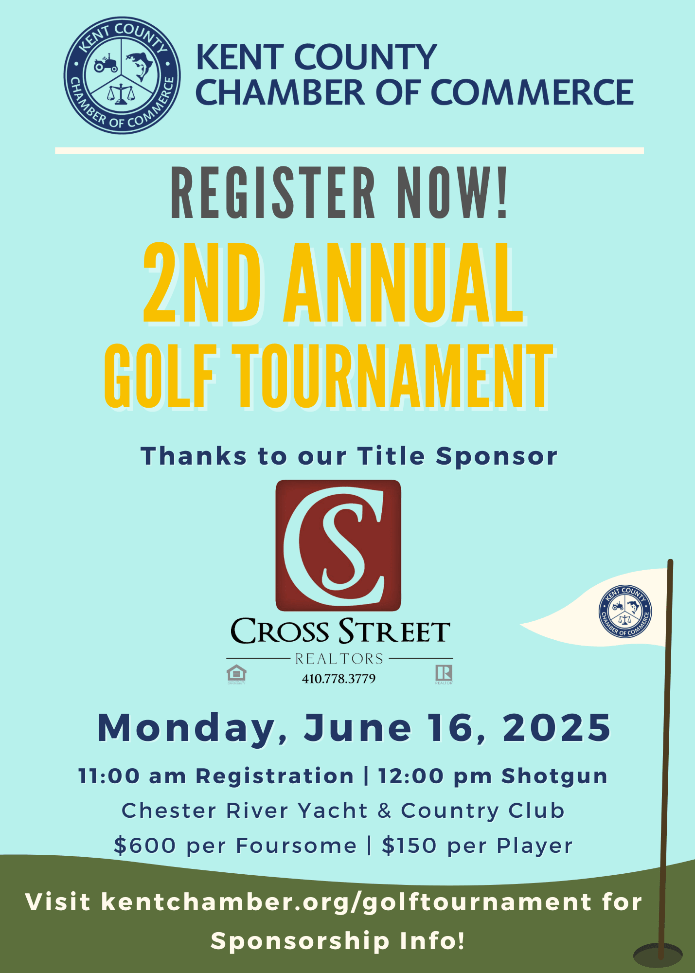 Kent County Chamber of Commerce's 2nd Annual Golf Tournament to be held on Monday, June 16th at the Chester River Yacht & Country Club. Teams of four play in a Scramble Format. 11:00 am Registration with Shotgun Start at Noon.