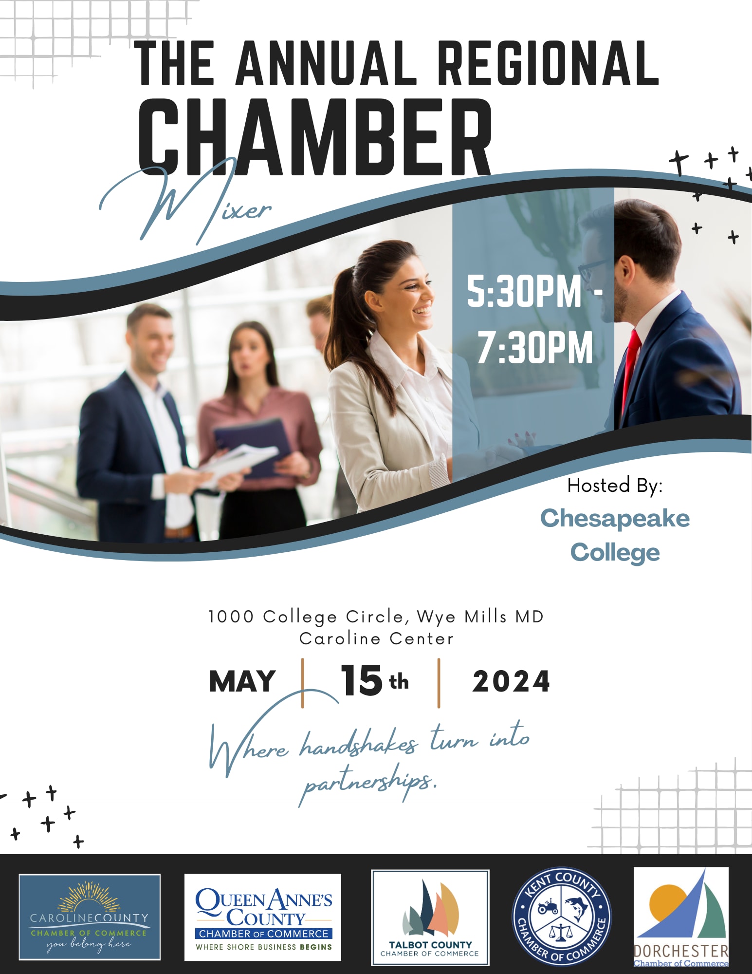 Join the Kent, Queen Anne's, Talbot, Caroline, and Dorchester Counties Chambers of Commerce for a collaborative Regional Mixer event at Chesapeake College. This event brings together business and community leaders from across the region to network. Attendance is free!