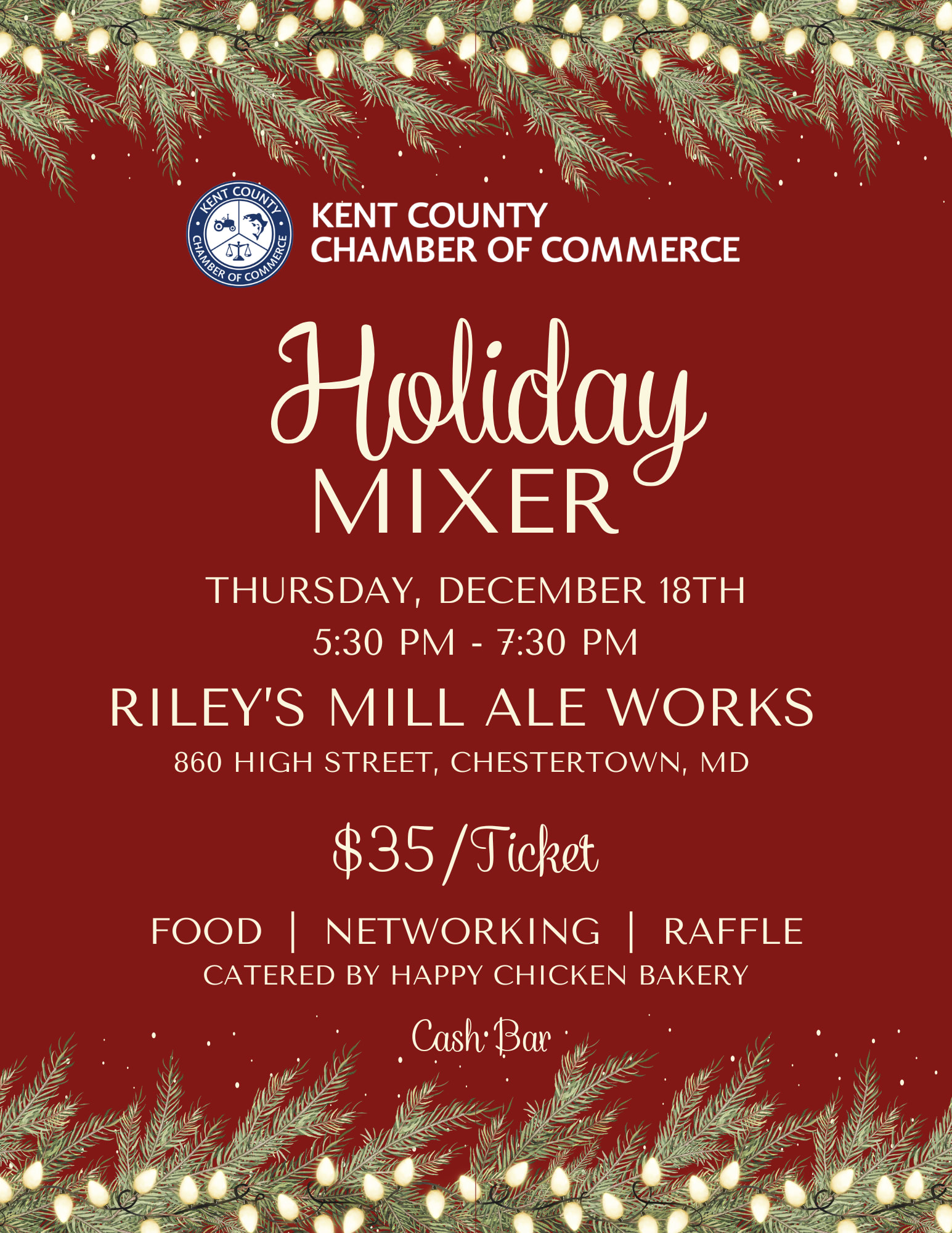Join the Kent County Chamber of Commerce for a Holiday Mixer at Riley's Mill Ale Works on December 18th from 5:30 pm to 7:30 pm. We will have delicious food from Happy Chicken Bakery, networking, and a raffle included in the $35 ticket price with a cash bar.