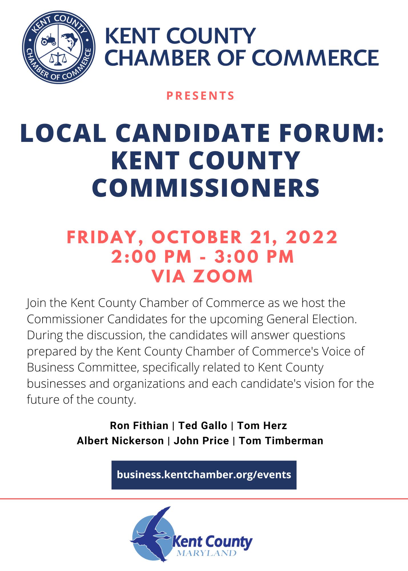 The Kent County Chamber of Commerce will host the Commissioner Candidates for the upcoming General Election on Friday, October 21st at 2:00 p.m. via Zoom. During the discussion, the candidates will answer questions prepared by the Kent County Chamber of Commerce's Voice of Business Committee, specifically related to Kent County businesses and organizations and each candidate's vision for the future of the county.